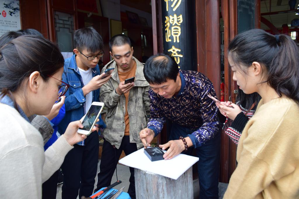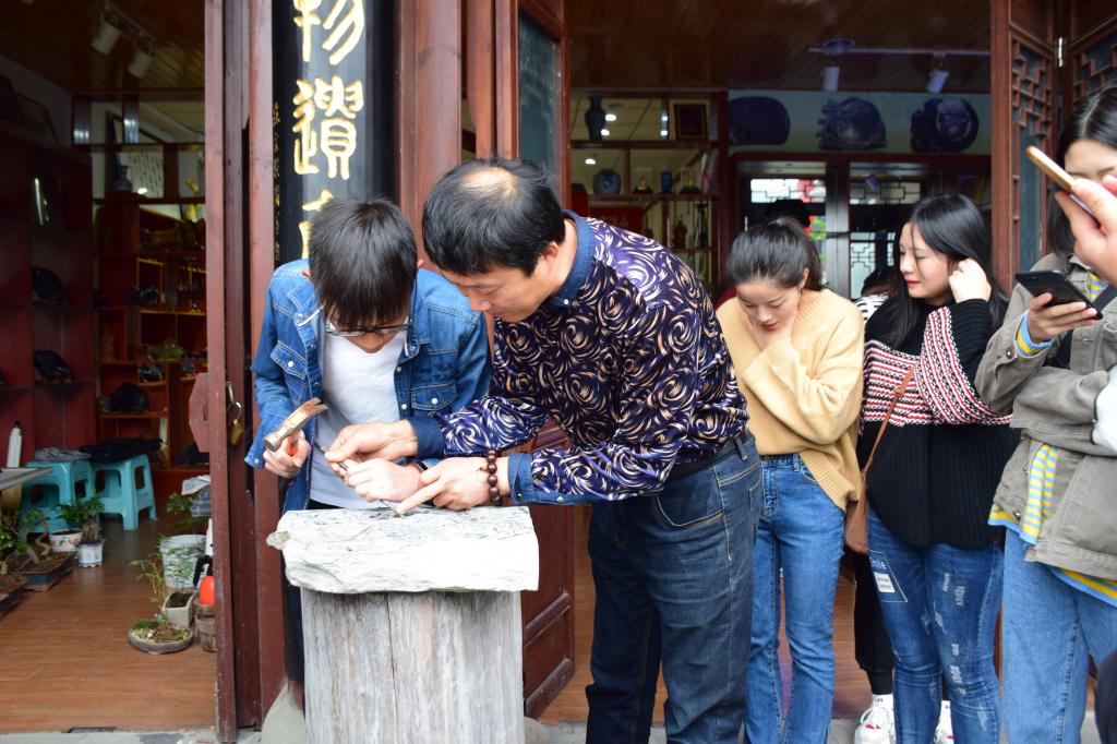 职业院校是培养“大国工匠”的摇篮,必须将工匠精神的培育贯穿于教育教学全过程,把工匠精神刻入学生心中。本次系列活动走近合川区市级非物质文化遗产项目合川峡砚,通过参观非遗传承文化深刻体会工匠精神的内涵。合川峡砚制作技艺代表性传承人、2017年重庆合川区首批“合川工匠”易宗成老师向同学们详细介绍了峡砚的制作过程及峡砚文化,并现场向我们展示了峡砚雕刻的过程。同学们通过亲身体验深刻体会到非遗文化中专注、敬业、精益、创新的匠人精神。