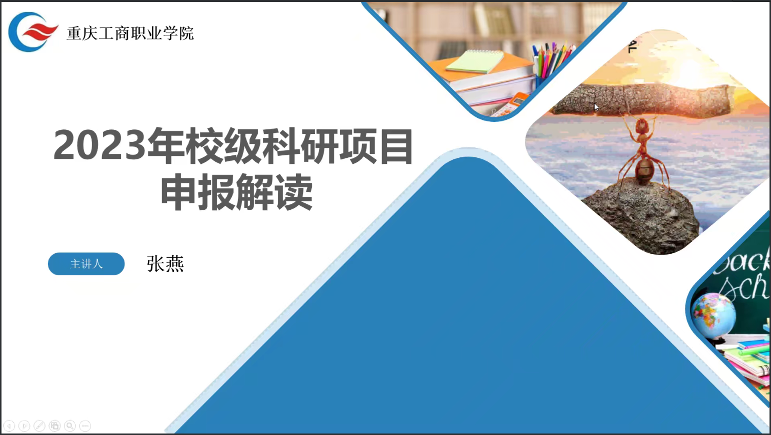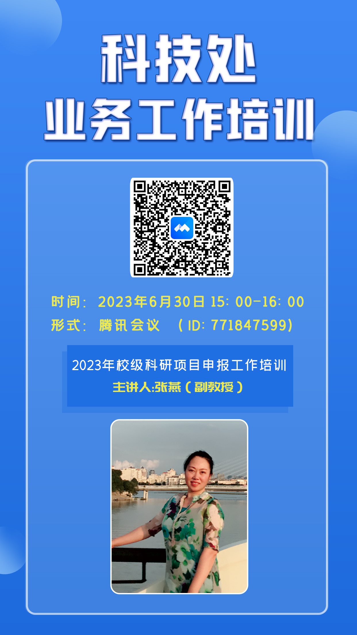 根据学校科研工作安排,为保障教职工顺利开展2023年校级科研项目工作申报,2023年6月30日下午3点,科技处利用腾讯会议方式,举办了《2023年校级科研项目申报培训》工作会,张燕老师主要从:一、科研项目申报须知(申报时间、内容、较往年表动、注意事项);二、项目立项评审;三、申报项目专家经验展开。