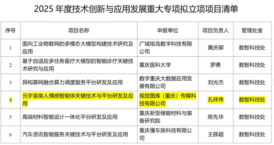 近日,由视觉图库(重庆)传媒科技有限公司、重庆大学、重庆工商职业学院、科大讯飞股份有限公司联合申报的“元宇宙类人情感智能体关键技术与平台研发及应用” 项目,成功获批2025年度技术创新与应用发展重大专项项目立项,我校承担子项到账经费150万。