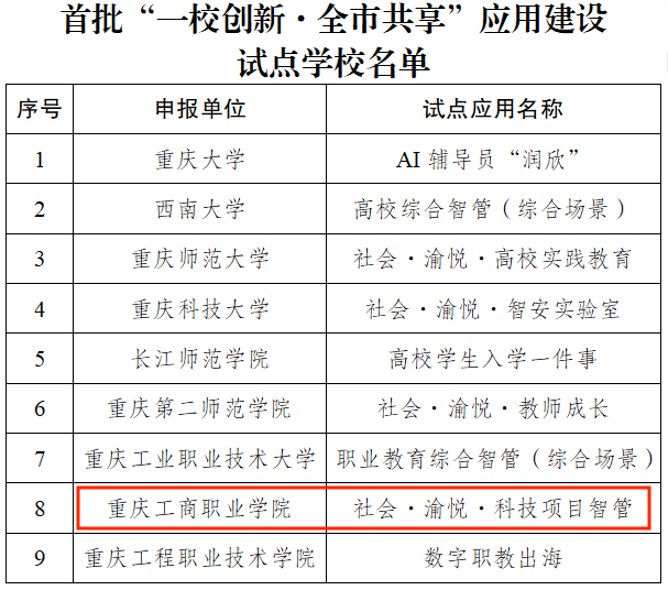 近日,重庆市教育委员会办公室发布首批“一校创新·全市共享”应用建设试点学校名单,我校凭借“社会·渝悦·科技项目智管”试点应用成功入选。