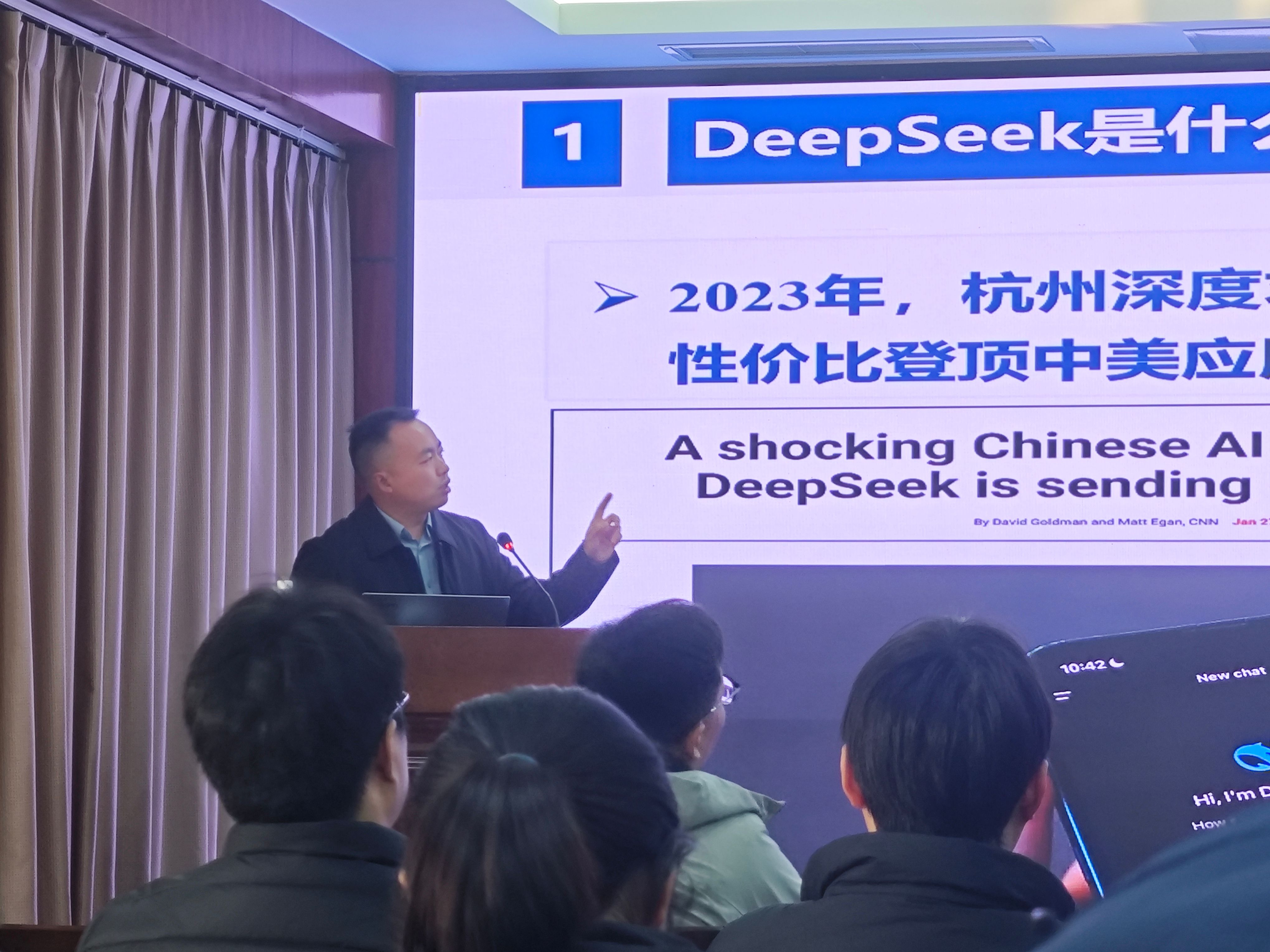 本次论坛特邀国家级青年人才、重庆市杰青、重庆大学计算机学院教授向朝参主讲。向教授以介绍DeepSeek为切入点,深入探讨了人工智能的发展态势,并基于团队最新研究成果,阐述了如何借助智能手机、智能建筑、智能汽车、无人机等现有的普及型移动感知设备资源实现城市的大规模移动群体智能感知,以及在此基础上进一步构建人机物群智大模型。