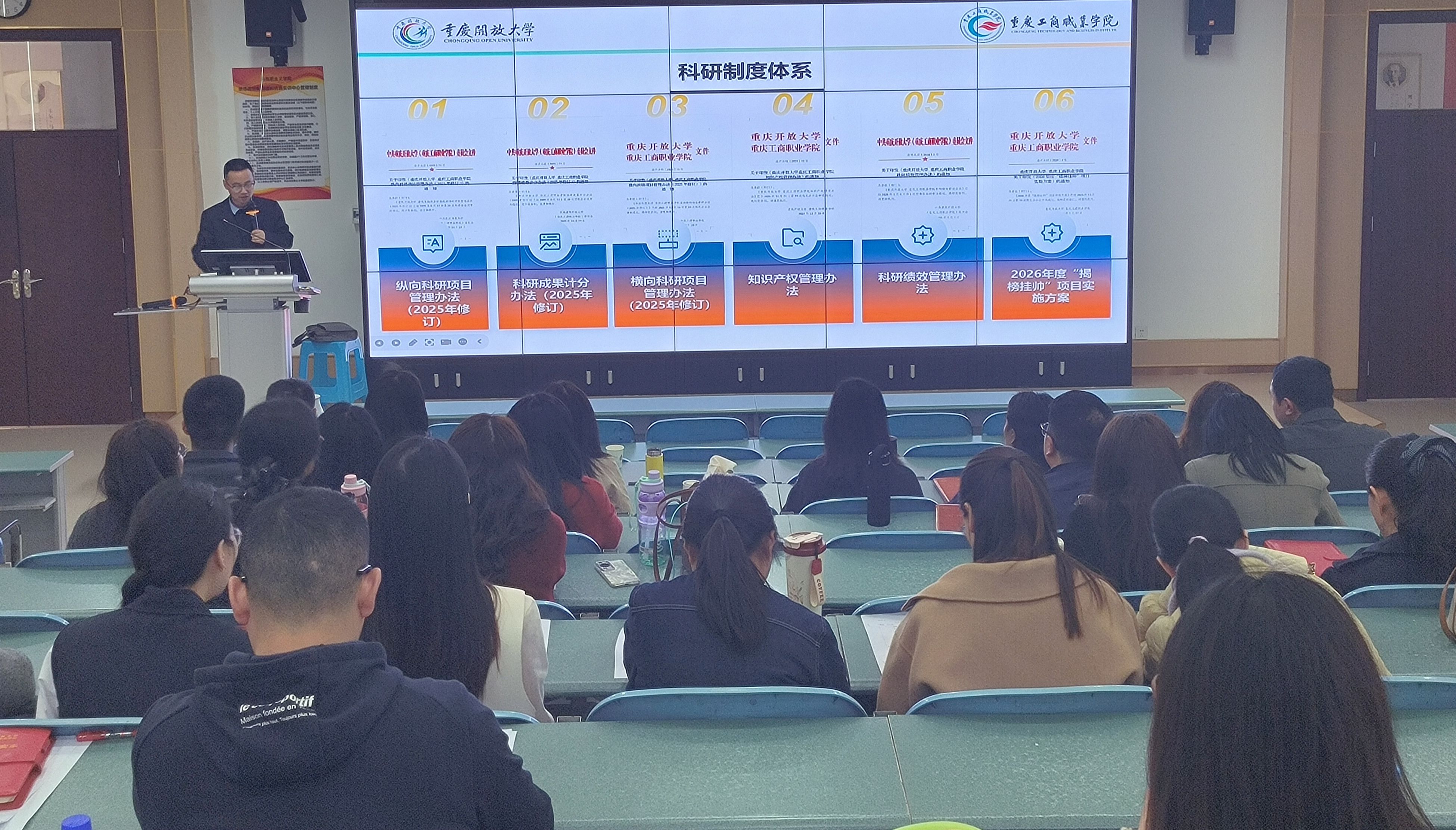 科技处副处长贾晓东重点就人文社科类项目的申报渠道、成果认定标准、经费使用规范及绩效奖励机制等内容作了详细说明,帮助教师准确把握政策要点,理清科研思路。他结合马克思主义学院的学科特点,重点介绍了学院教师依托学科优势开展社会服务的方向与渠道。